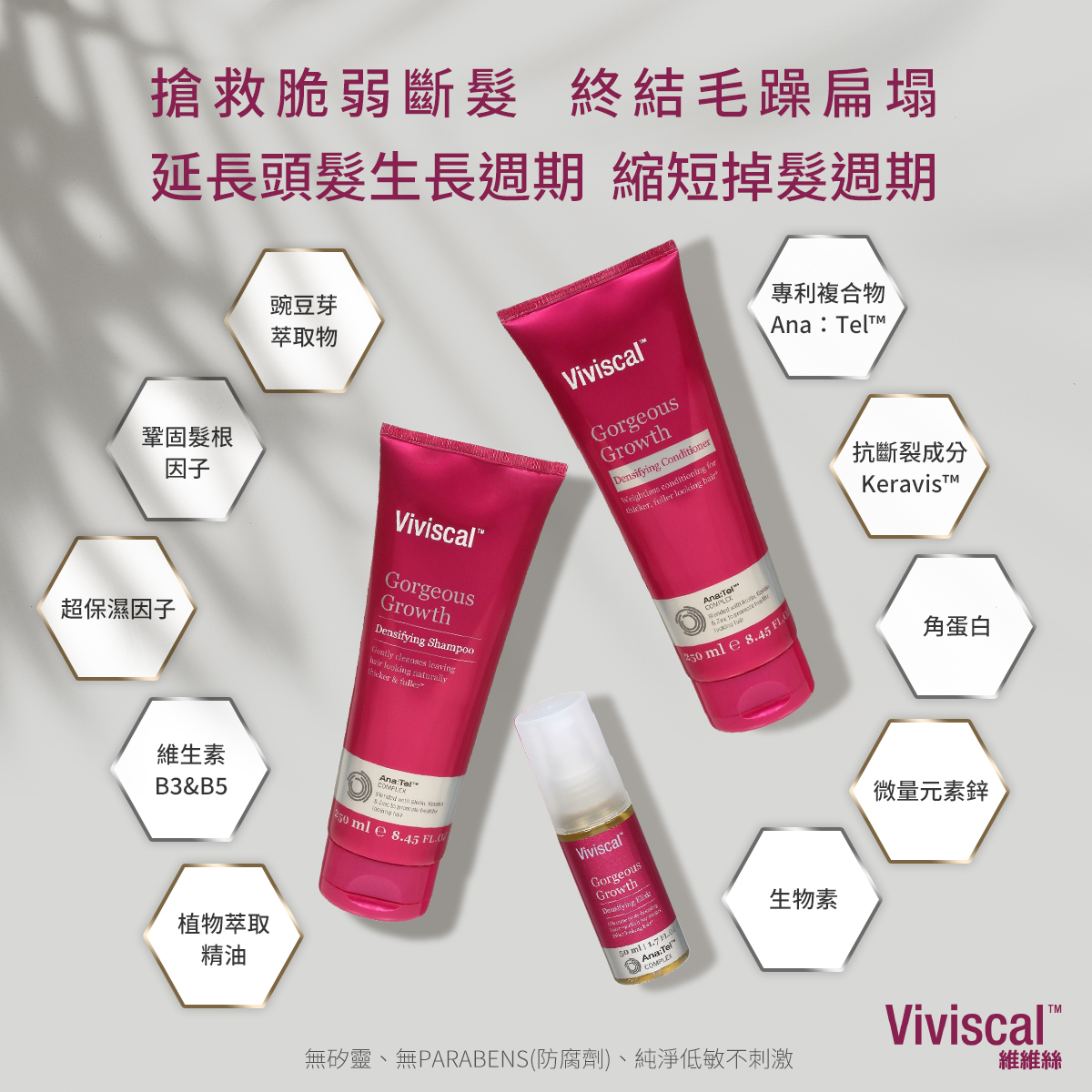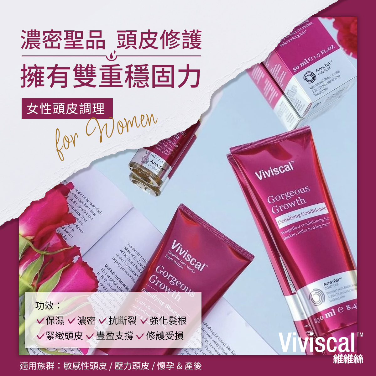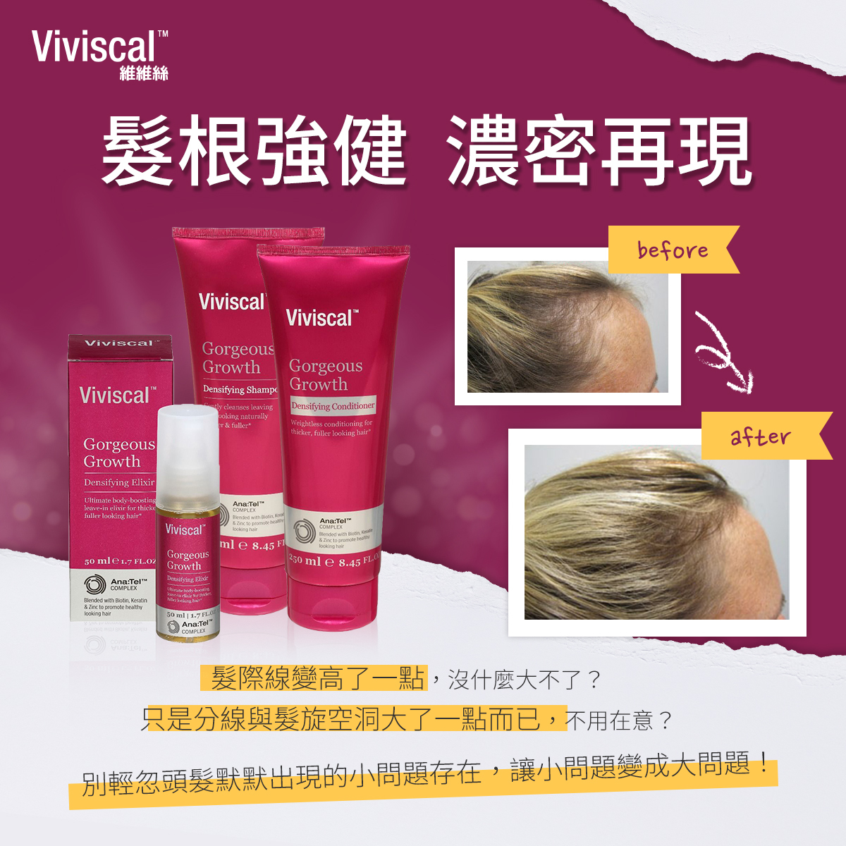 Viviscal 維維絲提供科學配方的產品,從內在活絡毛髮的(Viviscal維維絲 女性營養膳食補充錠)和(Viviscal 維維絲蓬潤濃密調理洗髮精 和 Viviscal 維維絲蓬潤亮澤調理潤髮乳),甚至可以為濃密的頭髮提供即時覆蓋。