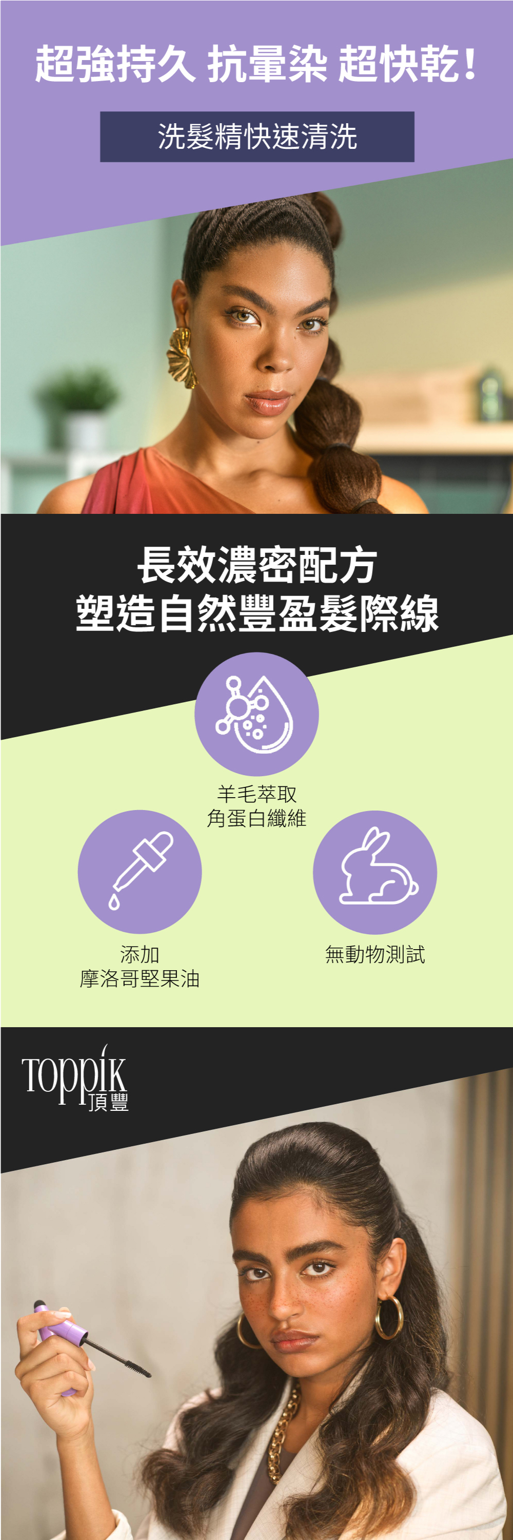 A:防水抗汗,可持續至洗髮前。避免高摩擦動作(如用力抓頭)以維持最佳狀態。